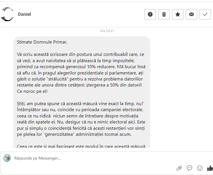 “Gestul” administrației târgoviștene nu a scăpat netaxat, fiind unul profund injust, pentru contribuabilii corecți, cei care plătesc la timp, după cum au remarcat mulți dintre târgovișteni. Cum reacțiile acestora nu își găsesc un loc de dialog și în spațiile de comunicare publică, cele gestionate de administrația locală, Valahia Media publică una dintre acestea, așa cum a fost adresată (n.m.– este o scrisoare publică, într-un fel) către administrația locală de la Târgoviște:
