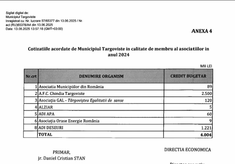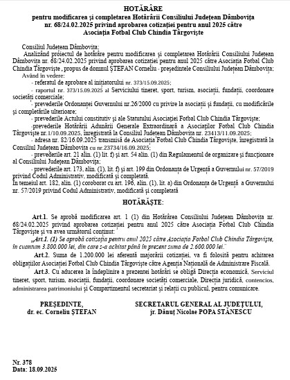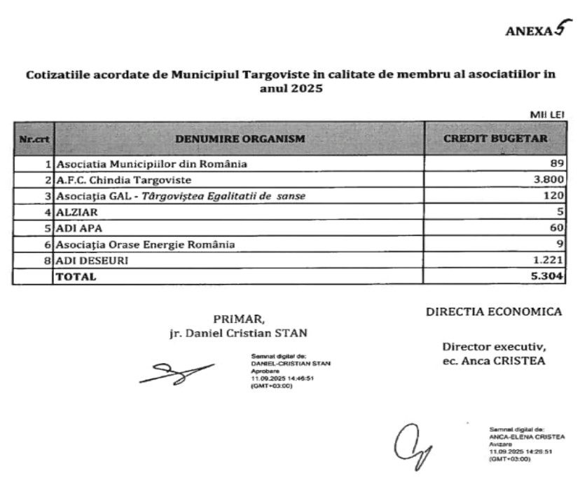 După mai multe rectificări succesive, pe parcursul anului 2025, de la aproximativ 2 milioane de lei cotizație, plătibilă de asociatul Primăria Târgoviște, în structura clubului de fotbal AFC Chindia Târgoviște, s-a ajuns ca această cotizație să crească la valoarea de 3,8 milioane de lei, în septembrie 2025. Cu alte cuvinte, o dublare a sumei.