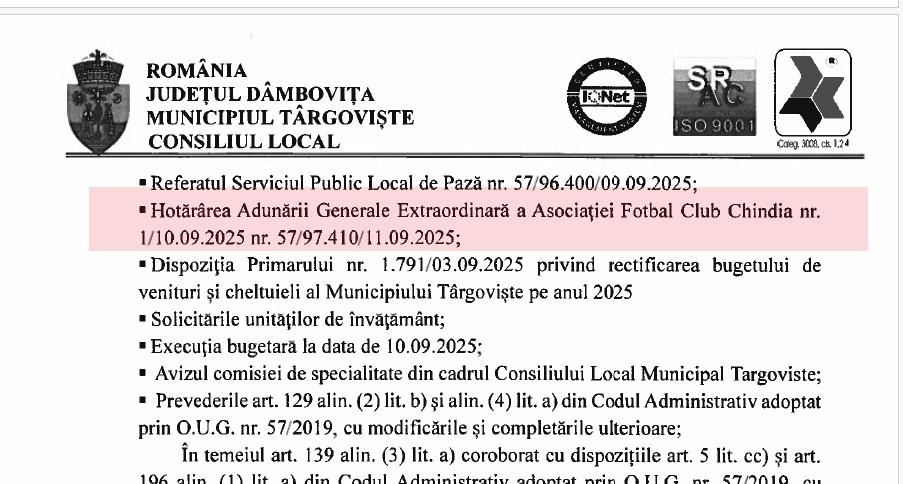 Nici măcar faptul că proiectul de hotărâre, cel prin care se realiza rectificarea bugetară, ce aloca Chindiei bani în plus, la capitolul cotizații, de la Primăria Târgoviște, nu cuprindea și scriptic solicitarea oficială a celor de la Chindia, cum se procedează legal, nu a mai trezit vreo mirare, în rândul consilierilor de la Târgoviște. Proiectul de hotărăre a fost adoptat chiar cu acest minus (n.m. – unul mai degrabă intenționat), legal obligatoriu.