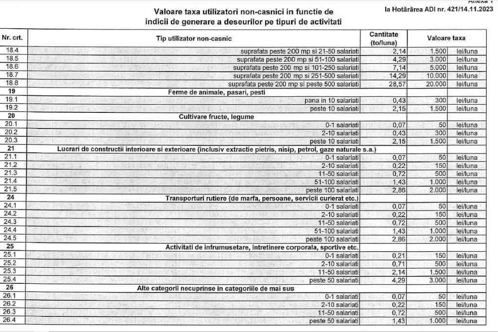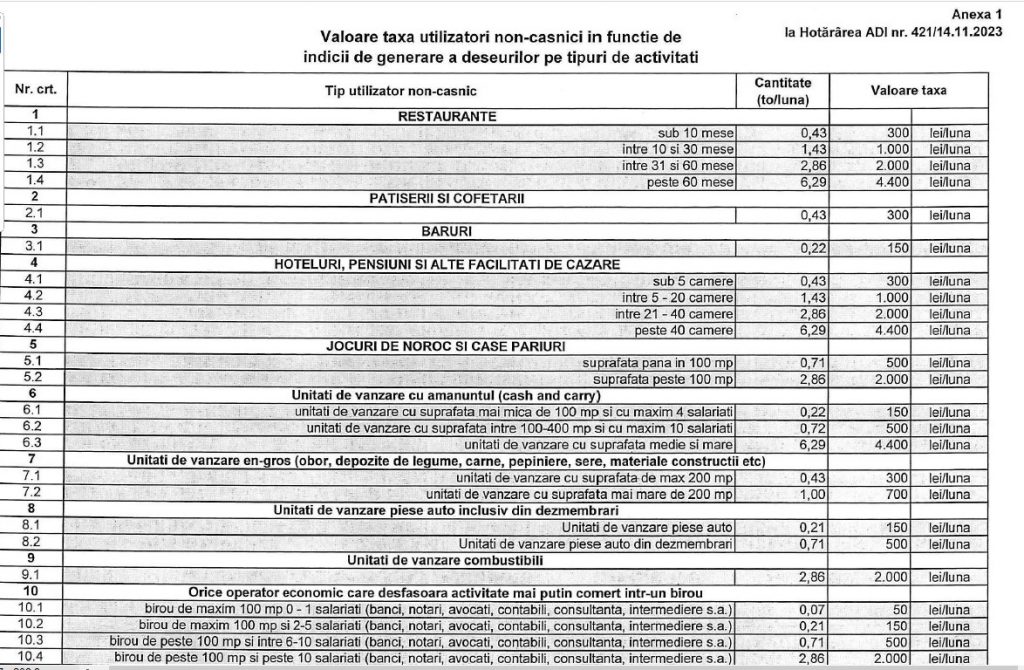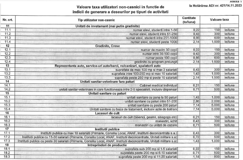 Cu specificarea că în termen de 30 de zile, firmele, utilizatorii non-casnici, trebuie să declare, pe proprie răspundere, la ce categorie de taxare se vor încadra de acum înainte (n.m.- depunerea de declarații se face la serviciul de taxe și impozite local), iată care sunt tarifele ce intră în vigoare de la 1 ianuarie 2024, pentru firmele din Târgoviște (peste 7000 de entități):