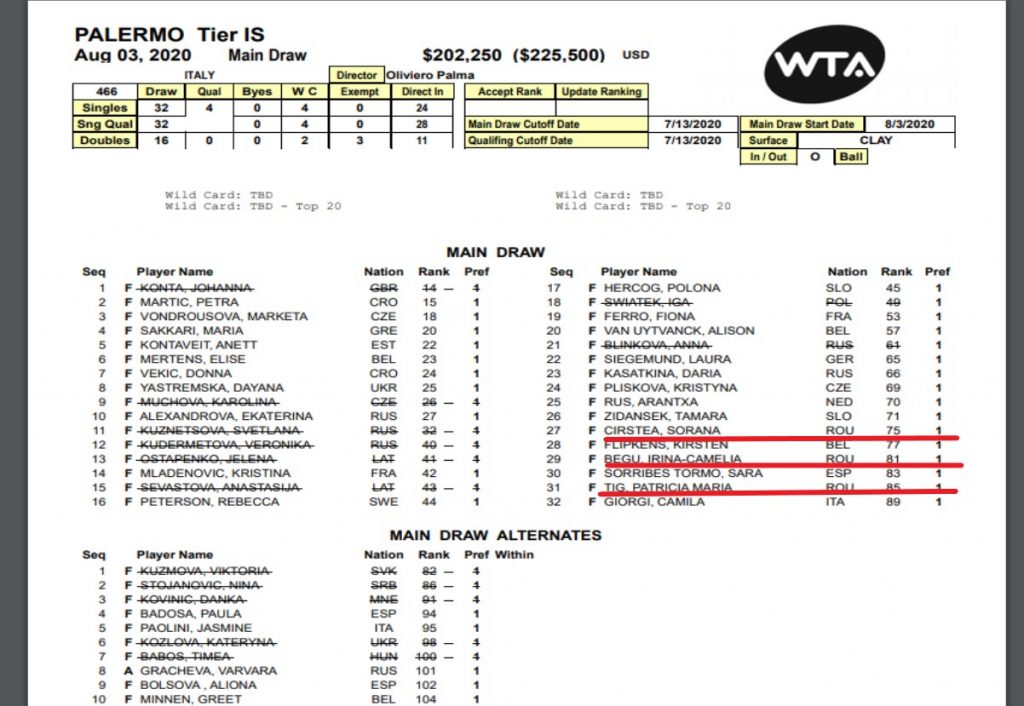 În cele din urmă organizatorii (vezi foto mai sus) au anunțat un “draft” (aproape final) al tabloului principal, la care se adaugă jucătoarele ce își vor câstiga dreptul de participare venind din calificări. Pe tabloul principal au fost acceptate 3 românce. Sorana Cîrstea (nr.75 WTA),Irina Camelia Begu (nr.81 WTA) și Patricia Țig (nr.85 WTA). Toate cele trei pe ultima sută de metri ,având în vedere numărul mare de retrageri, ale unor jucătoare ce inițial completau tabloul principal.