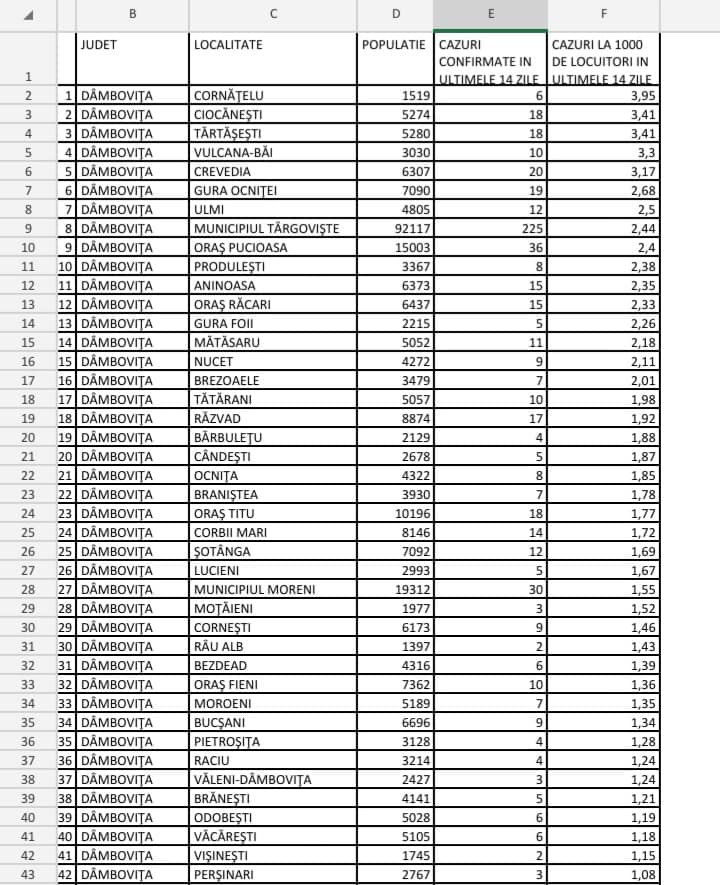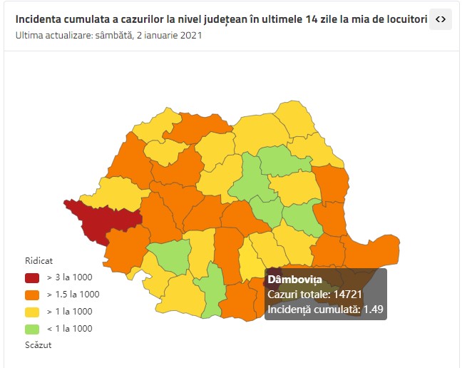În județul Dâmbovița mai sunt doar 5 localități în scenariul roșu (incidență mai mare de 3 la mie), în condițiile în care au fost raportate doar 33 de cazuri noi astăzi și 40 în data de 1 ianuarie ( în spitalele din Dâmbovița au fost raportate 5 decese covid-19, în perioada 30 decembrie -1 ianuarie, totalul deceselor fiind, de la debutul pandemiei, de 446, în data de 1 ianuarie 2020). În momentul de față, doar la Cornățelu, Ciocănești, Tărtășești, Vulcana Băi și Crevedia mai este în vigoare “scenariul roșu” (incidență de peste 3 la mie). Și rata generala de incidență (pentru tot județul) a scăzut sub 1,5 la mie, Dâmbovița intrând în așa numită zonă verde (incidență actuală este de 1,49 la mie).