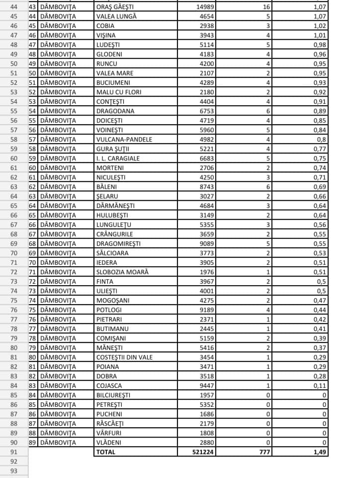 Au fost raportate doar 1194 de cazuri noi, dintr-un total de 4438 de teste. Dintre cazurile noi, 33 sunt în județul Dâmbovița, unde rata de incidență a scăzut la valoarea de 1,49.