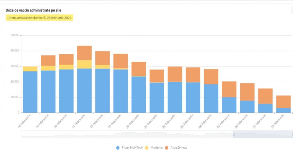 La nivel național, din păcate, se remarca o scădere a numărului de persoane vaccinate zilnic. În ultimele 2 săptămâni, de la un număr maxim de persoane vaccinate (de aproximativ 43.000) în data de 17 februarie 2021, numărul celor vaccinați zilnic a scăzut constant, astfel că, în data de 28 februarie, au fost vaccinați doar aproximativ 11.000 de români (doar cu vaccinurile Astra Zeneca și Pfizer, vaccinul Moderna nemaiifind disponibil, pentru vaccinare în România, din data de 26 februarie).