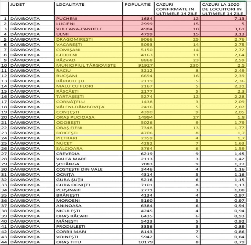 În Dâmbovița, în momentul de față (1 martie 2021) sunt 4 localități în scenariul roșu (incidență de peste 3 la mie), respectiv Pucheni, Lucieni, Vulcana Pandele și Ulmi. Primele două, din acestă listă, se află în carantină. Alte 22 de localități din Dâmbovița sunt în scenariul galben (incidență a cazurilor de peste 1,5 la mie). Se constată de asemenea o creștere importantă a numărului de cazuri și la Târgoviște (cea mai numeroasă comunitate din județ), numărul cazurilor active fiind de 230 (în data de 1 martie )-incidență de 2,5 la mie, cu o creștere constantă în ultimele zile, a numărului de cazuri.