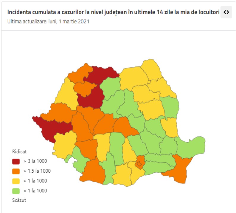 Numărul de cazuri noi de îmbolnăvire cu noul coronavirus este în creștere în cele mai multe din județele țării. Sunt deja ( la 1 martie 2021) trei județe în scenariul roșu, pe lângă Timiș și Maramureș si județul Cluj a reintrat în aceste scenariu (incidență mai mare de 3 la mie).