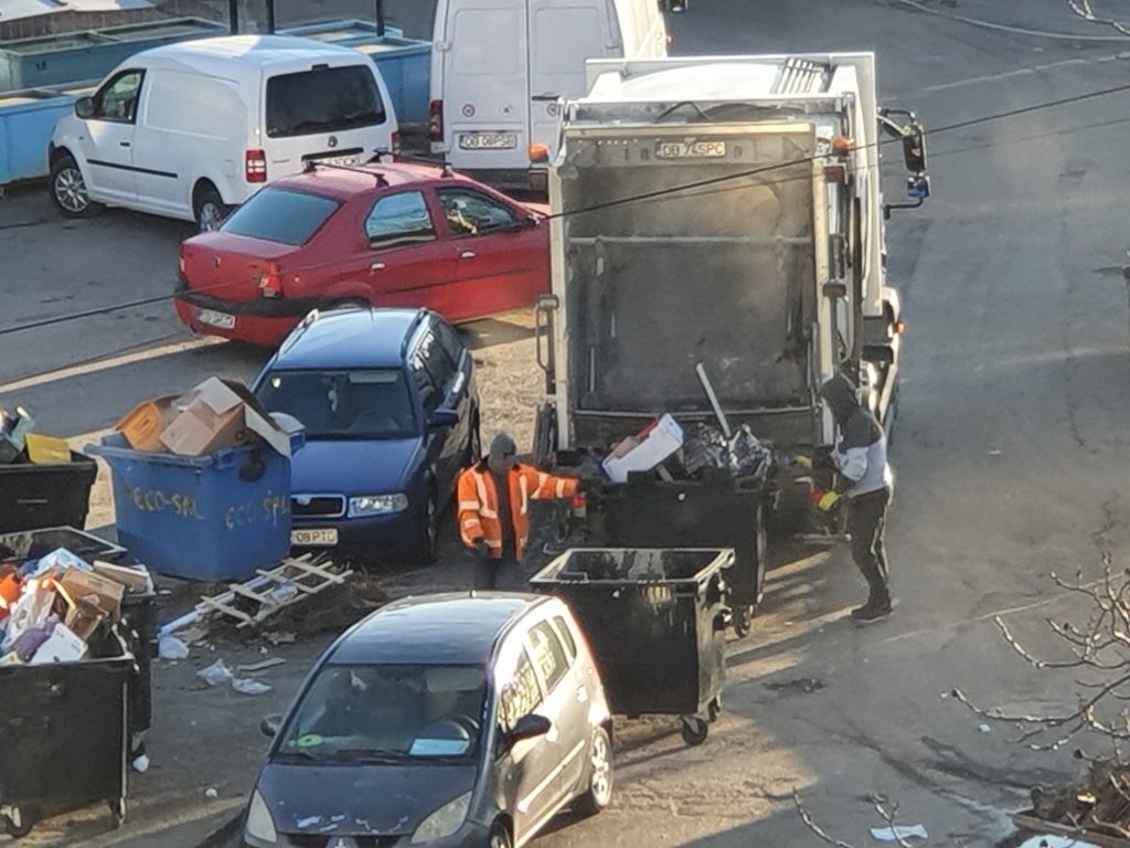 Foto: Colectare (Supercom) gunoi menajer, din “insulele ecologice digitalizate” (20.03.2025). Tomberoanele, din plastic, sunt deșertate în mașina de gunoi, la grămadă, indiferent de natura deșeurilor din acestea